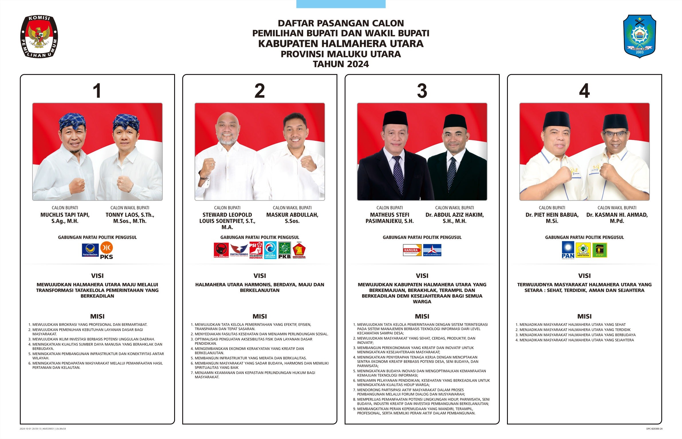 #TemanPemilih, bersama ini KPU Kabupaten Halmahera Utara mengumumkan Keputusan KPU Kabupaten Halmahera Utara Nomor 156 tahun 2024 tentang Penetapan Nomor Urut Pasangan Calon Bupati dan Wakil Bupati Kabupaten Halmahera Utara Dalam Pemilihan Tahun 2024, sebagai berikut :