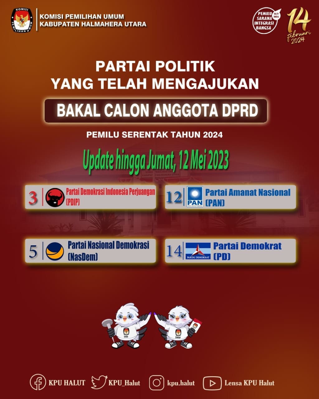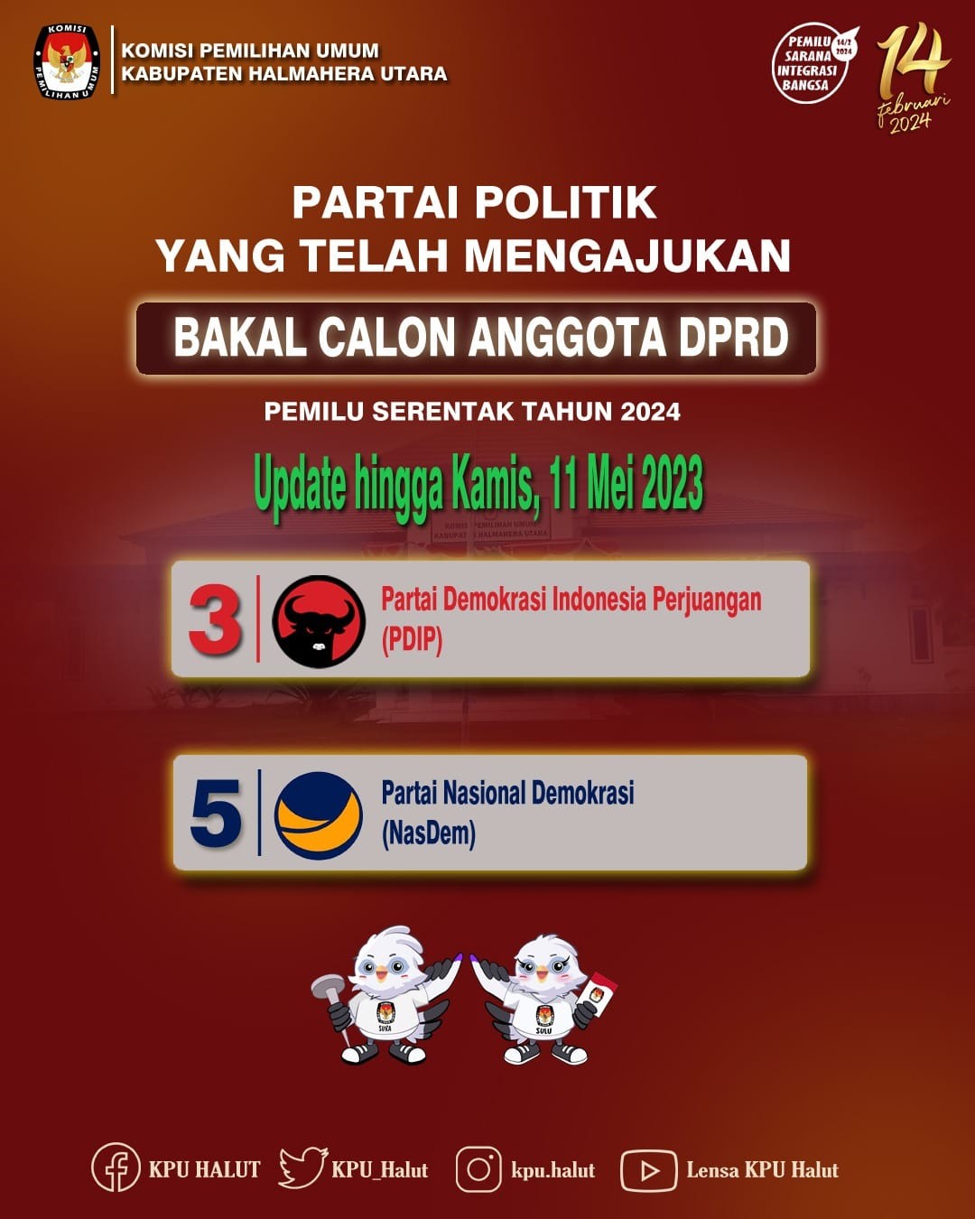 #TemanPemilih. Ketua KPU Kabupaten Halmahera Utara, Muhammad Rizal, didampingi Anggota KPU Kabupaten Halmahera Utara, Sefriando Bitakono, Abdul Djalil, Asmawati Marsaoly, Ircham Paludu Puni serta Sekretaris KPU Halut Najmah Kalauw, menerima Pengajuan Bakal Calon Anggota Dewan Perwakilan Rakyat Daerah (DPRD) Kabupaten Halmahera Utara dari Partai Demokrasi Indonesia (PDI) Perjuangan dan Partai NasDem di Sekretariat KPU Kabupaten Halmahera Utara, di Jalan Kawasan Pemerintahan Nomor 2B, Desa MKCM, Kecamatan Tobelo. Turut Hadir Sekretaris PDIP Halmahera Utara Irwan Djam beserta rombongan tiba di KPU Kabupaten Halmahera Utara pada pukul 10.00 WIT dan juga Ketua Partai NasDem Halmahera Utara Muchlis Tapi Tapi beserta rombongan yang tiba di KPU Kabupaten Halmahera Utara pada pukul 13.35 WIT. Adapun dokumen Persyaratan yang diajukan oleh PDIP dan Partai NasDem Halmahera Utara telah dinyatakan lengkap dan diterima disaksikan oleh Bawaslu Kabupaten Halmahera Utara. Kamis, (11/5/2023).   #KPUMelayani #PemiluSerentak2024